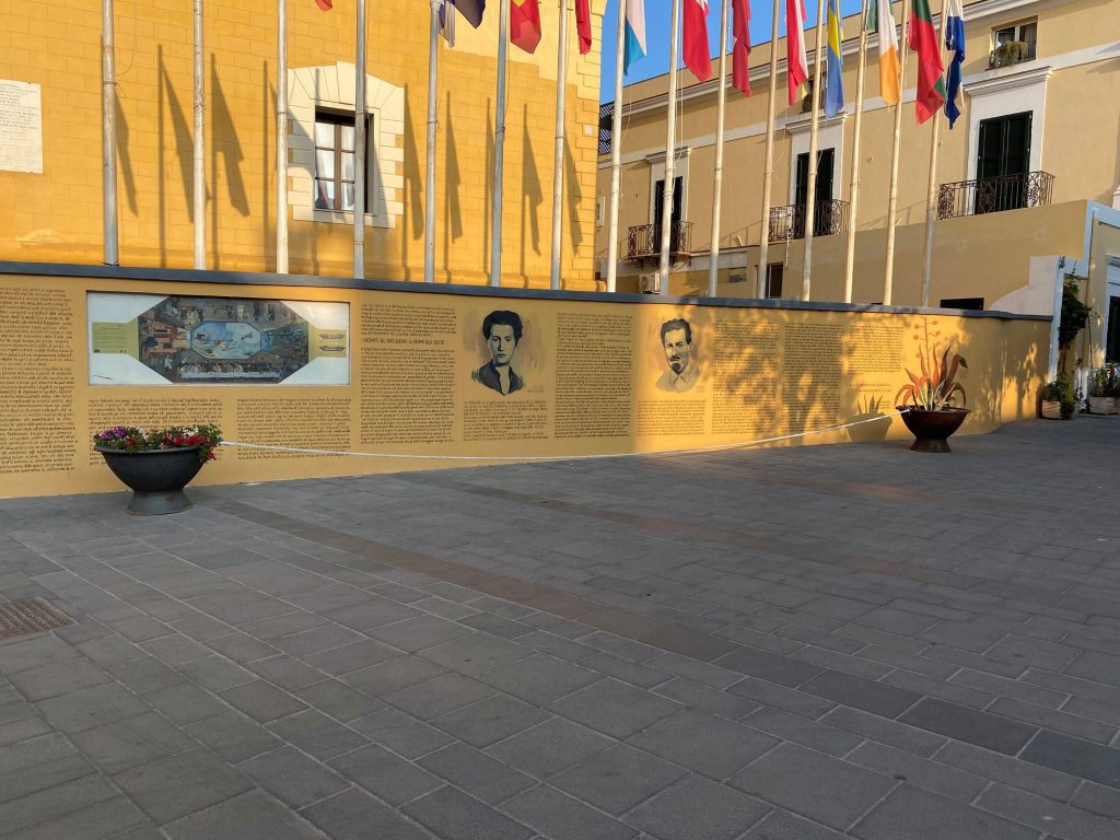 L’isola è molto affascinante, bel mare, meta di turisti e velisti. Belle piazzette e già subito appena arrivata, in Piazza Castello, sul muretto che delimita l’edificio del Municipio mi sono trovata di fronte al Manifesto per un’Europa libera e unita trascritto in versione integrale dall’artista Giovanni Anastasia con Valeria Iozzi. Un’opera di arte muraria realizzata grazie all’iniziativa “EU Street Art” promossa dalla Rappresentanza in Italia della Commissione Europea.